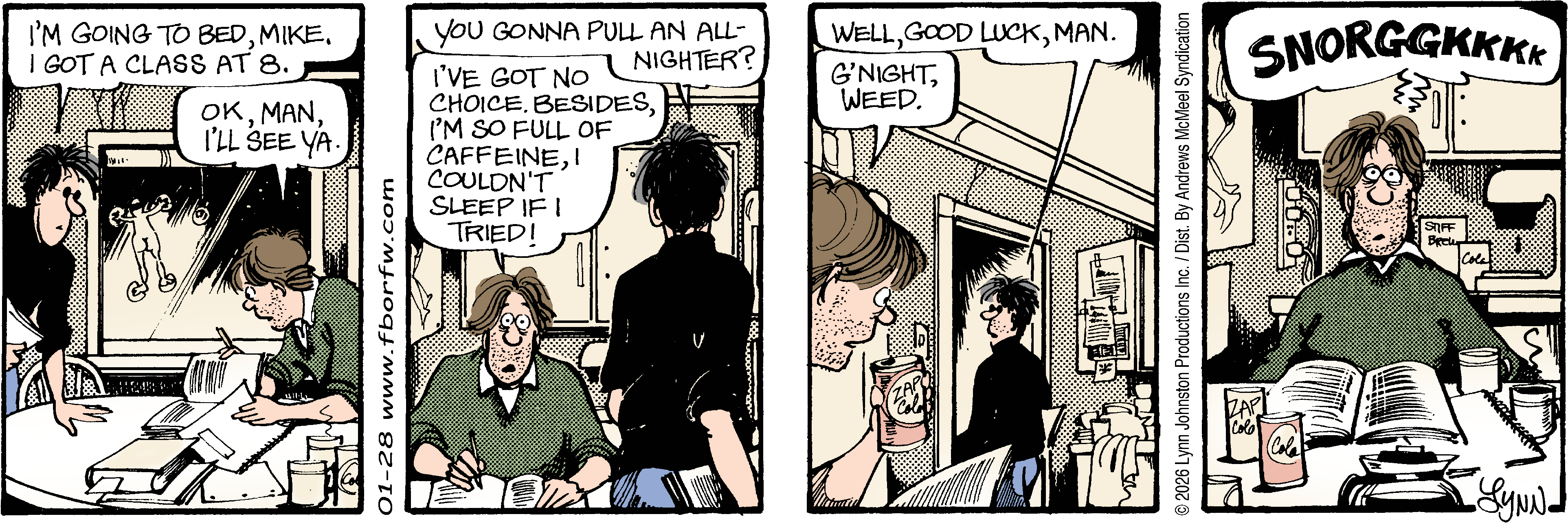 Lynn's Comments: I think this is the first time “Ned” appeared in the strip. It was against the rules to show a naked backside in the “funny papers,” so, naturally, I wanted to test the waters. Stuck to the window of Mike and Weed’s apartment was a tiny, naked plastic man. Ned appeared regularly and was never “caught” by an editor.